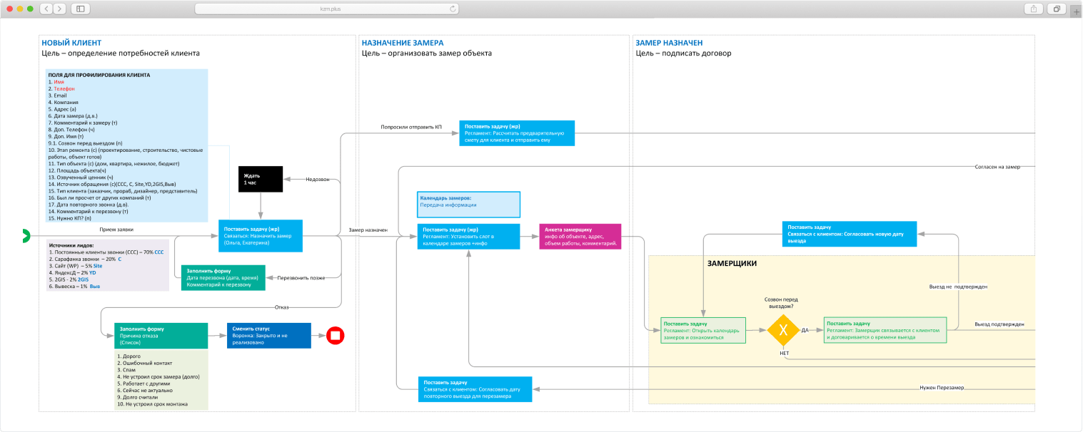 Удобное распределение замеров по свободным замерщикам. Исключена возможность потерять замер. Замеры распределяются равномерно по карте города и загрузке замерщиков.